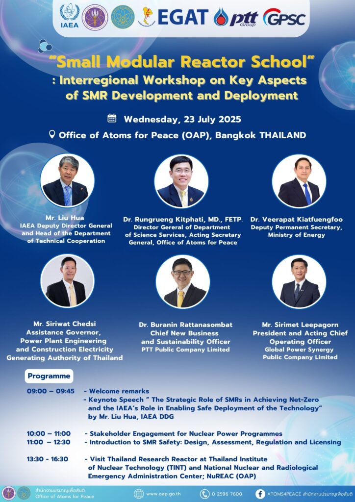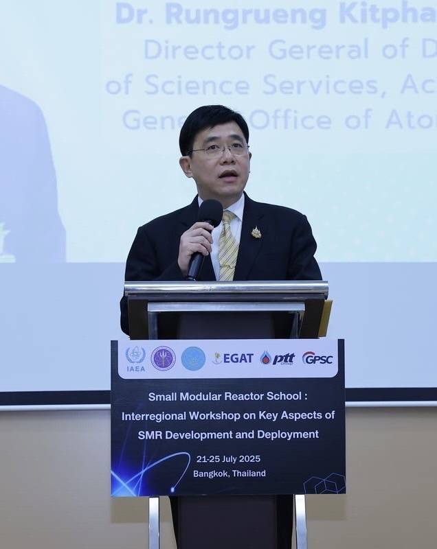 นายแพทย์รุ่งเรือง กิจผาติ อธิบดีกรมวิทยาศาสตร์บริการ รักษาราชการแทนเลขาธิการสำนักงานปรมาณูเพื่อสันติ (ปส.) กระทรวงการอุดมศึกษา วิทยาศาสตร์ วิจัยและนวัตกรรม (อว.) เปิดเผยภายหลังกล่าวพิเศษบนเวทีการประชุมเชิงปฏิบัติการ “SMR School: Interregional Workshop on Key Aspects of SMR Development and Deployment” ในวันที่ 23 กรกฎาคม 2568 ณ ห้องประชุมใหญ่ ปส. ว่า ภายใต้นโยบายของกระทรวง อว. ที่มุ่งยกระดับศักยภาพด้านวิทยาศาสตร์ เทคโนโลยี และนวัตกรรมเพื่อการพัฒนาอย่างยั่งยืน ปส. ในฐานะหน่วยงานกำกับดูแลความปลอดภัยทางนิวเคลียร์และรังสีของไทย พร้อมสนับสนุนการเสริมสร้างองค์ความรู้อย่างรอบด้านเกี่ยวกับโรงไฟฟ้านิวเคลียร์มาตรฐานปลอดภัยขนาดเล็ก (SMR) ปส. จึงบูรณาการความร่วมมือกับทบวงการพลังงานปรมาณูระหว่างประเทศ (IAEA) การไฟฟ้าฝ่ายผลิตแห่งประเทศไทย (กฟผ.) บริษัท ปตท. จำกัด (มหาชน) (PTT) และบริษัท โกลบอล เพาเวอร์ ซินเนอร์ยี่ จำกัด (มหาชน) (GPSC) จัดประชุมดังกล่าวขึ้น เพื่อเสริมสร้างความเข้าใจเกี่ยวกับ SMR ซึ่งเป็นเทคโนโลยีพลังงานสะอาดที่ปลอดภัยและปล่อยคาร์บอนต่ำ ให้แก่ผู้มีส่วนเกี่ยวข้องในระดับนโยบาย วิชาการ และการกำกับดูแลของประเทศไทย โดยเปิดเวทีแลกเปลี่ยนองค์ความรู้ระหว่างผู้เชี่ยวชาญด้านเทคนิค หน่วยงานกำกับดูแล และผู้กำหนดนโยบายจาก 11 ประเทศ จำนวน 93 คน ในระหว่างวันที่ 21–25 กรกฎาคม 2568 ณ โรงแรมอัศวิน แกรนด์ คอนเวนชั่น และ ปส.
